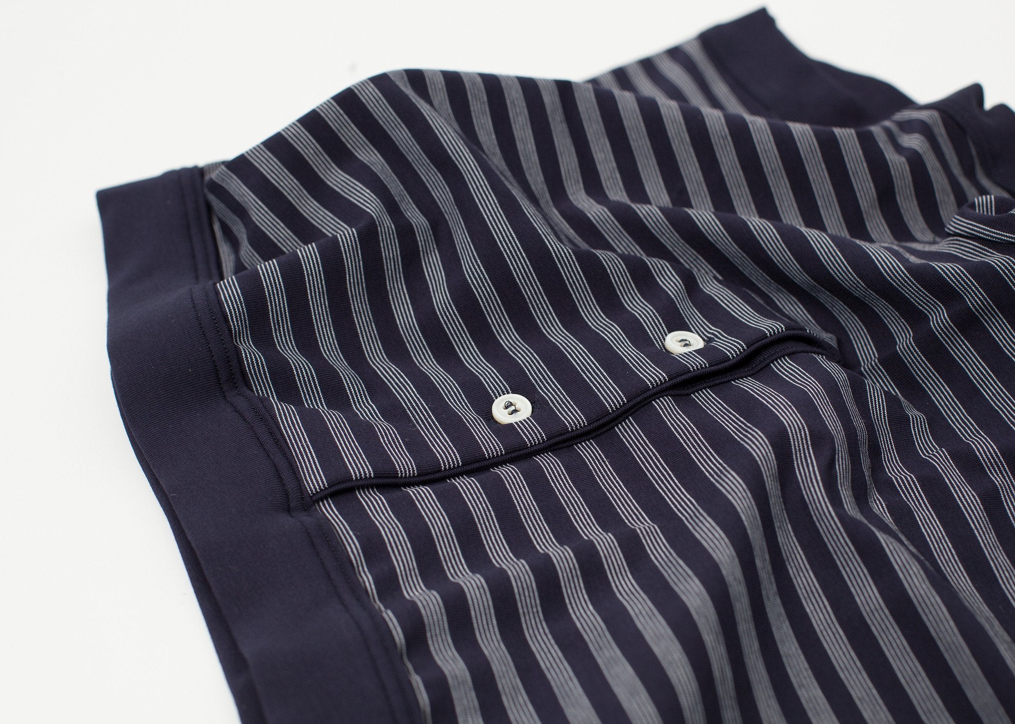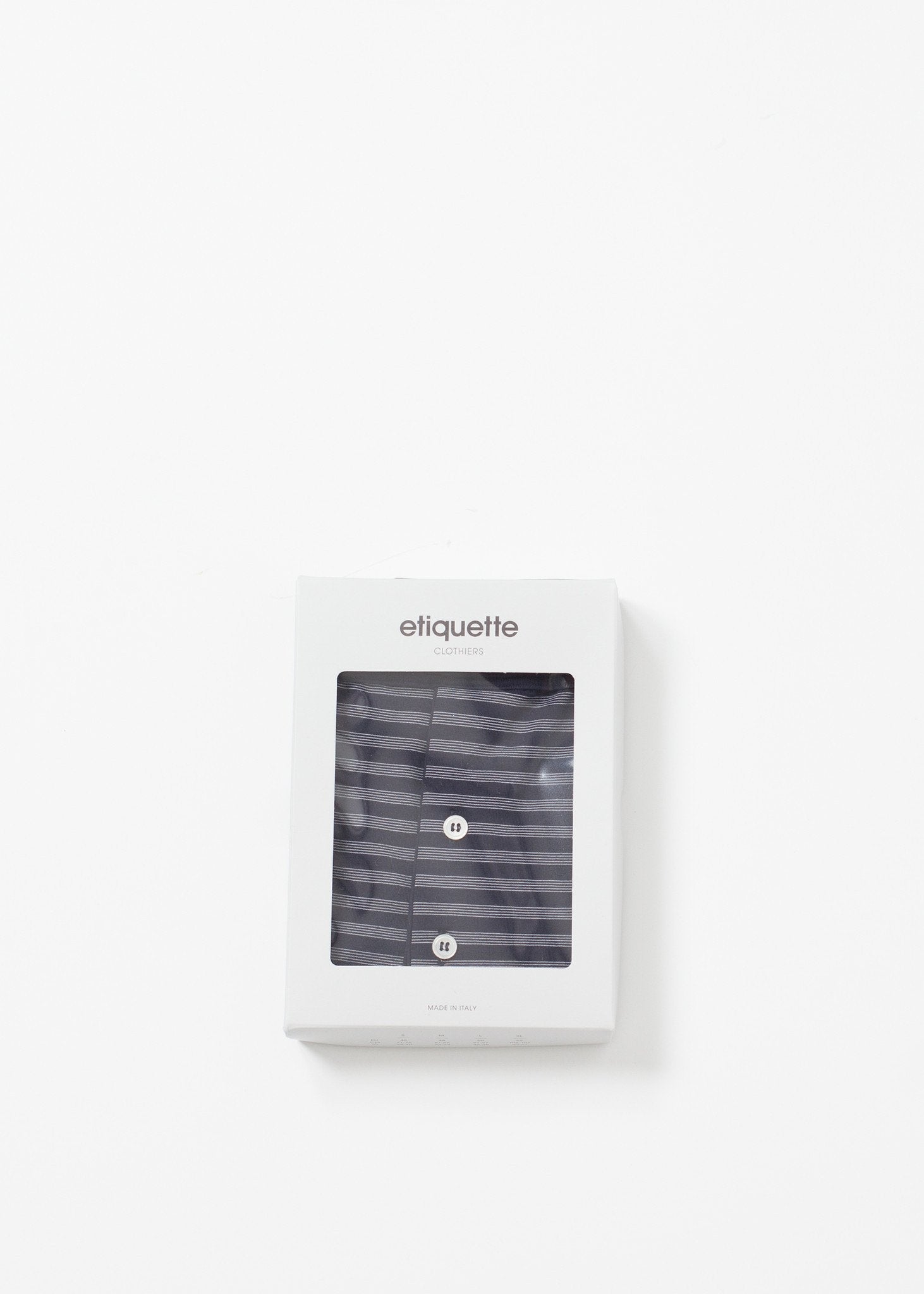 This prewashed cotton trunk is composed of the finest gauge for the softest materials. Offers stretch and softness in wear. Elastic waistband for ease. Etiquette. Color Navy/Grey. 95% Cotton, 5% Elastane. Made in Italy.